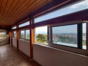 Εσωτερική σκάλα που οδηγεί σε μεγάλο μπαλκόνι με πανοραμική θέα